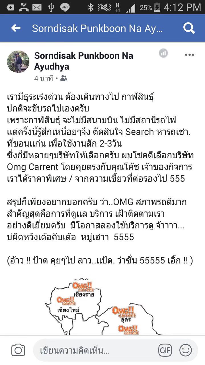 | เวลาทำการ : | รับจองรถเช่าผ่าน Line @ ได้ 24 ชม รับส่งรถฟรี 7:15-20:30 ทุกวัน กดไอคอน เฟสบุ๊ค และไอคอนไลน์แอด นี้ เพื่อสะดวก รวดเร็วในการติดต่อ และติดตาม OMGcarrent ได้ที่นี่ กดเลย สะดวกมาก !! |