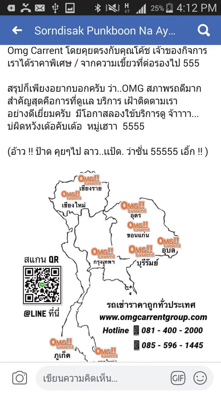 | เวลาทำการ : | รับจองรถเช่าผ่าน Line @ ได้ 24 ชม รับส่งรถฟรี 7:15-20:30 ทุกวัน กดไอคอน เฟสบุ๊ค และไอคอนไลน์แอด นี้ เพื่อสะดวก รวดเร็วในการติดต่อ และติดตาม OMGcarrent ได้ที่นี่ กดเลย สะดวกมาก !! |